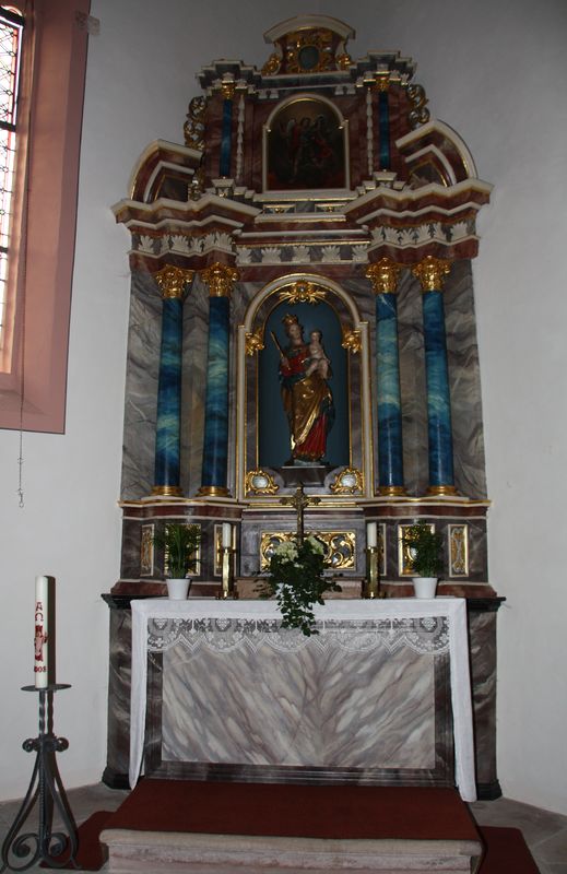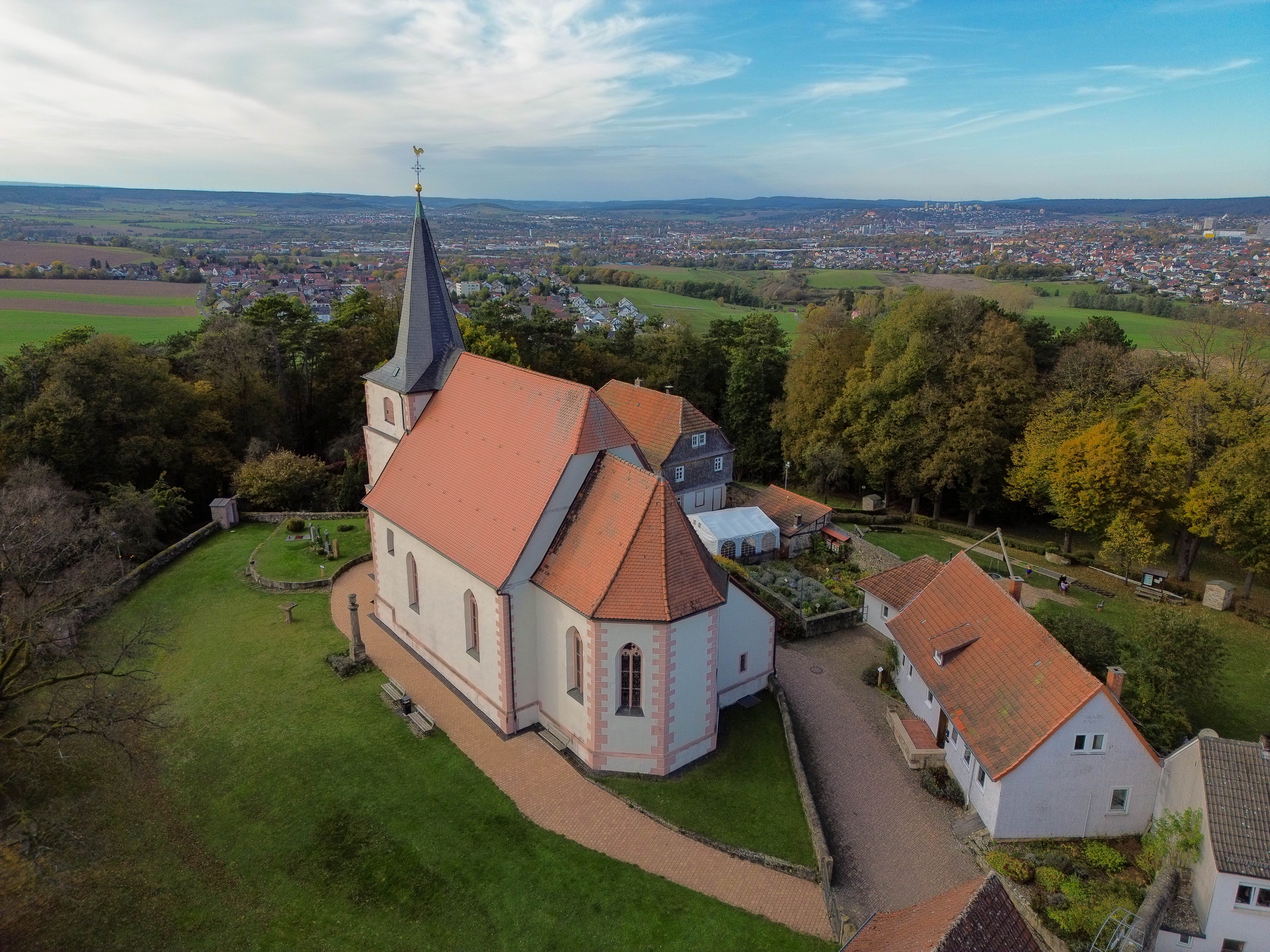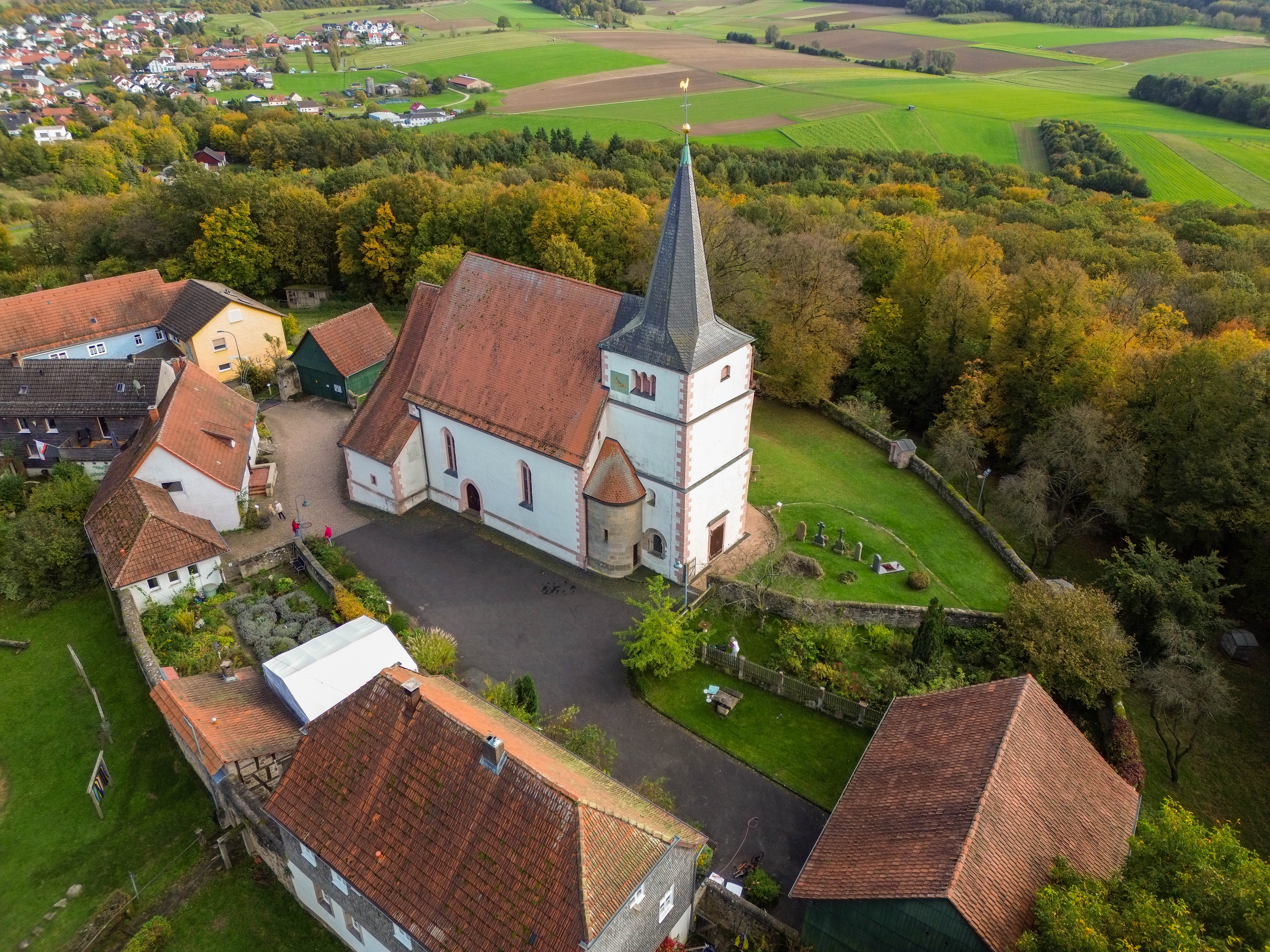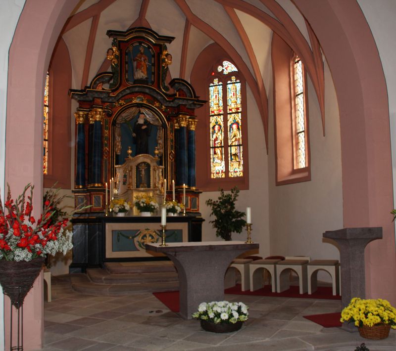 Die erste Kirche auf dem Florenberg wurde … um 900 von dem Fuldaer Abt Huoggi errichtet und der hl. Flora geweiht, die dem Berg den Namen gab. … Von der ersten Kirche ist nichts erhalten geblieben. …Nachdem jedoch die älteste Kirche der hl. Flora allein, die Vorgängerin der 1362 geweihten Kirche (= die 3. Kirche) hingegen auch dem hl. Kilian und dem hl. Bar-tholomäus geweiht war, ergibt sich daraus, dass nach dem Kirchenbau aus der Zeit um 900 und vor dem von 1362 zu unbekannter Zeit ein weiterer(= die 2. Kirche) errichtet wurde. Die Erklärung dafür, dass diese jüngere Kirche bei der Weihe neben der hl. Flora auch den hl. Kilian als Patron erhielt, ist sehr einfach. Bereits im Hochmittelalter suchten die Fuldaer Äbte die geistliche Oberhoheit des Bischofs von Würzburg in der näheren Umgebung ihres Klosters auszuschalten und sich selbst in ihren Besitz zu bringen, was ihnen nach und nach mit der Politik der kleinen Schritte auch gelang. Als nun in diesem Gebiet die Weihe einer neuen Kir-che anstand, bei der der Fürstabt den Bischof von Würzburg als immer noch zuständigen Diö-zesanbischof nicht umgehen konnte, benutzte dieser die Gelegenheit, seine Rechte deutlich zu machen, indem er die Kirche auf dem Florenberg neben der hl. Flora auch dem hl. Kilian, dem Patron des Bistums Würzburg, weihen ließ. ….. Wie bei den baulichen Maßnahmen im 14. Jahrhundert ließ man auch beim völligen Neubau der Kirche zu Beginn des 16. Jahrhunderts (= 4. Kirche) den Turm stehen. Dieser Kirchenbau, der sich im Wesentlichen bis heute erhalten hat, wurde von dem Johannesberger Propst Melchior Küchenmeister durchgeführt, der, …, 1509 die Inkorporation der Pfarrei Florenberg zugunsten seiner Propstei erlangt hatte. Nach einer Inschrift….wurde der Bau 1511 begonnen. 1515 wurde er einem Schlussstein über dem nördlichen Seitenportal und einem weiteren Stein über dem Chorbogen zufolge, die beide das Wappen Küchenmeisters tragen, vollendet. Die Weihe erfolgte … am 3. Mai 1516 durch den Würzburger Weihbischof Johann Pettendorfer. …. Bemerkenswert ist die Tatsache, dass die neue Kirche nun dem hl. Kilian allein geweiht war und die hl. Flora nicht einmal mehr wenigstens Patronin eines Altares war. Den Propst Küchenmeister hinderte das allerdings nicht, der Patronin des Florenberges auch weiterhin Geltung zu verschaffen. … Ihrem „Recht“ trug er auch dadurch Rechnung, dass er sie auf dem für die neue Kirche geschaffenen Sakramentshäuschen neben dem hl. Kilian darstellen ließ. 100 Jahre später, als die geistliche Oberhoheit des Würzburger Bischofs im Fuldaer Hochstift völlig beseitigt war, wurde auch das Kilianspatrozinium der Florenberger Kirche zeitweise ganz verdrängt….Der einzige grö-ßere Einrichtungsgegenstand der spätmittelalterlichen Kirche, der in die neue Kirche über-nommen wurde, scheint der Taufstein gewesen zu sein. Nach dem Wappen, das er trägt, und dem ihn umgebenden Spruchband wurde er 1500 von den Herren von Ebersberg, die inner-halb der Pfarrei Florenberg reich begütert waren, gestiftet. Er ist neben dem erwähnten Sak-ramentshäuschen und der Altarmensa, die auf der Rückseite die Jahreszahl 1516 trägt, das einzige Inventar der Kirche, das sich aus der Zeit ihrer Erbauung erhalten hat.