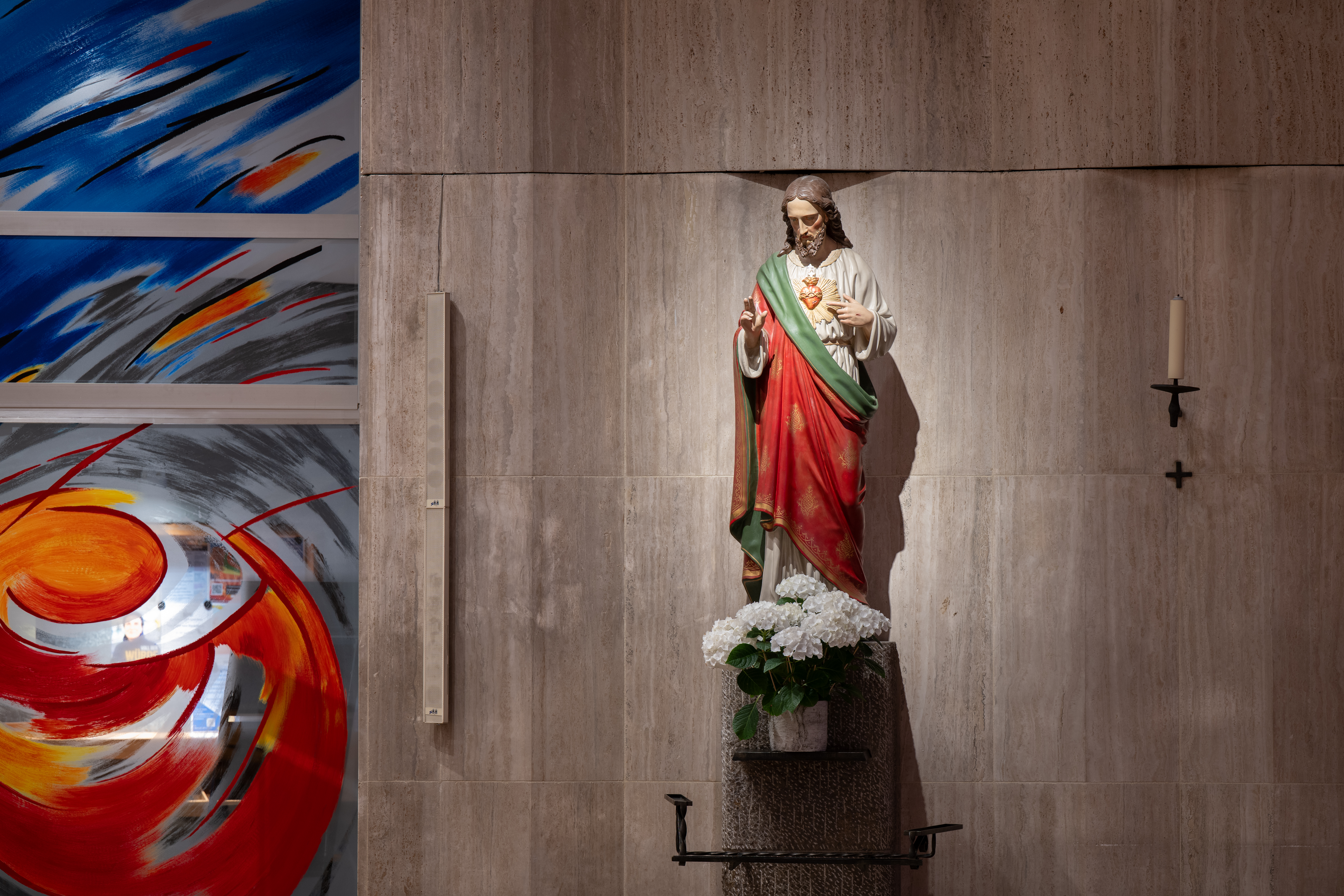 Jedoch weisen ihn Tabernakel und Kreuz, die in schlichtem Bronzeguss gehalten sind, auf die Ewigkeit hin.
