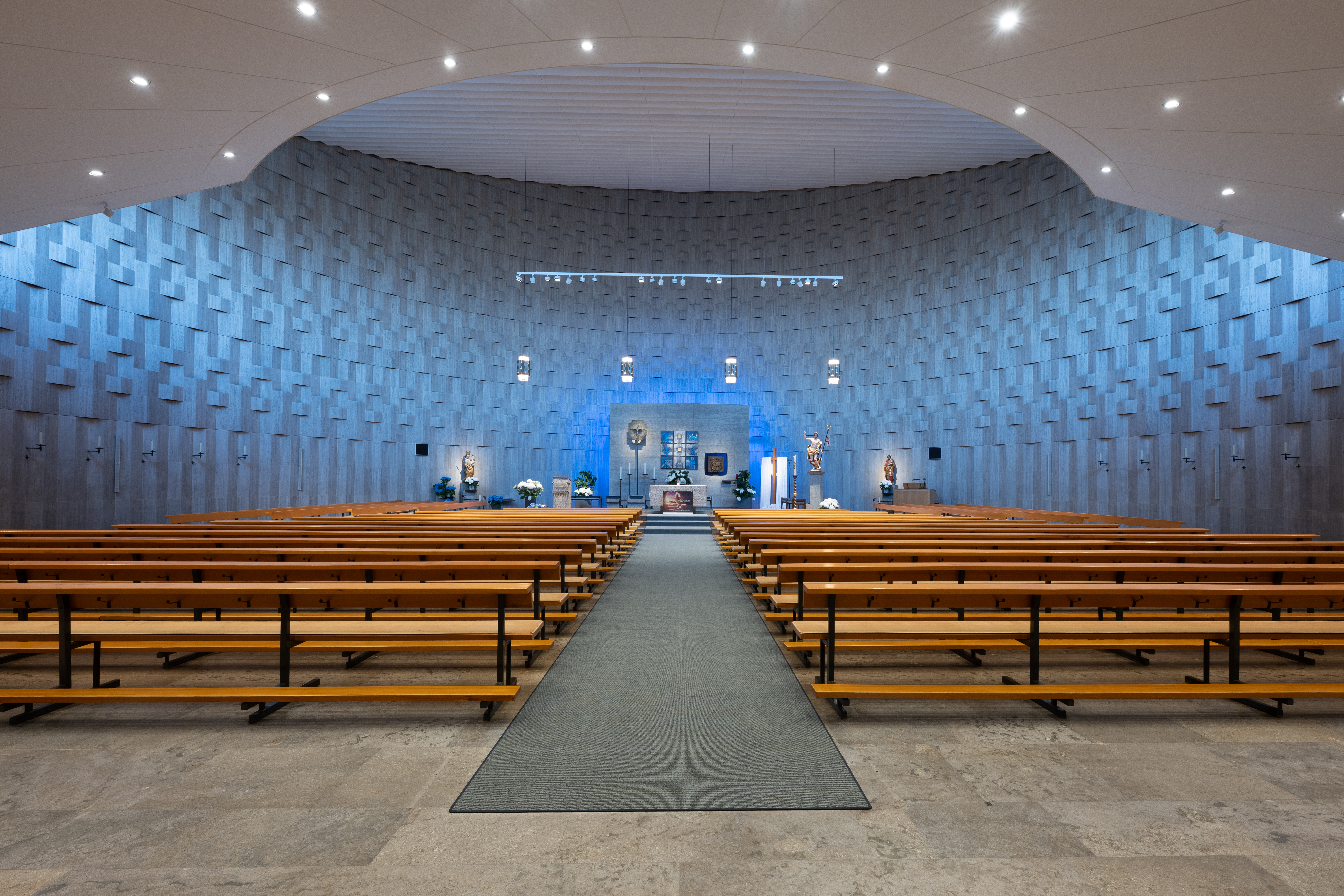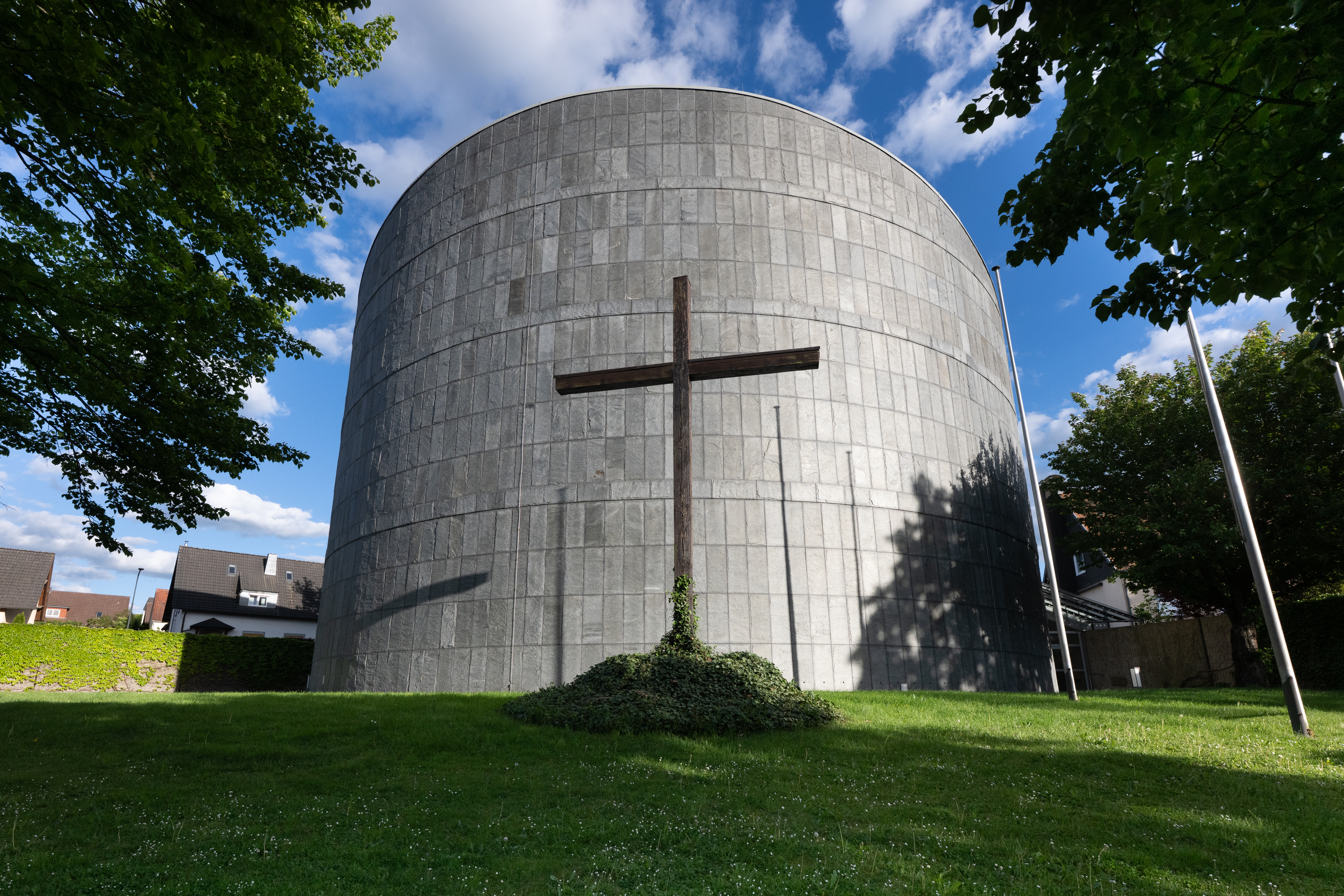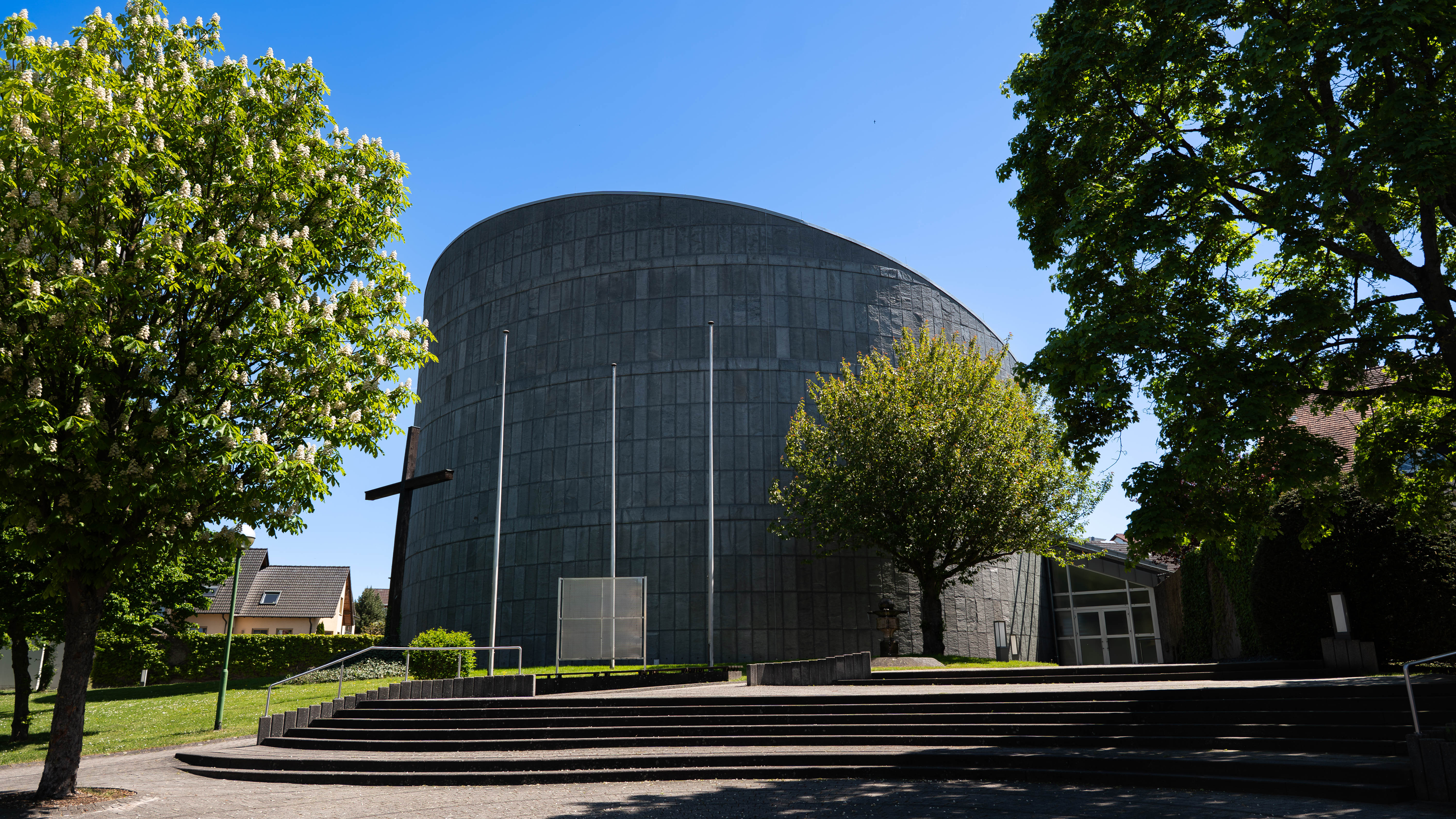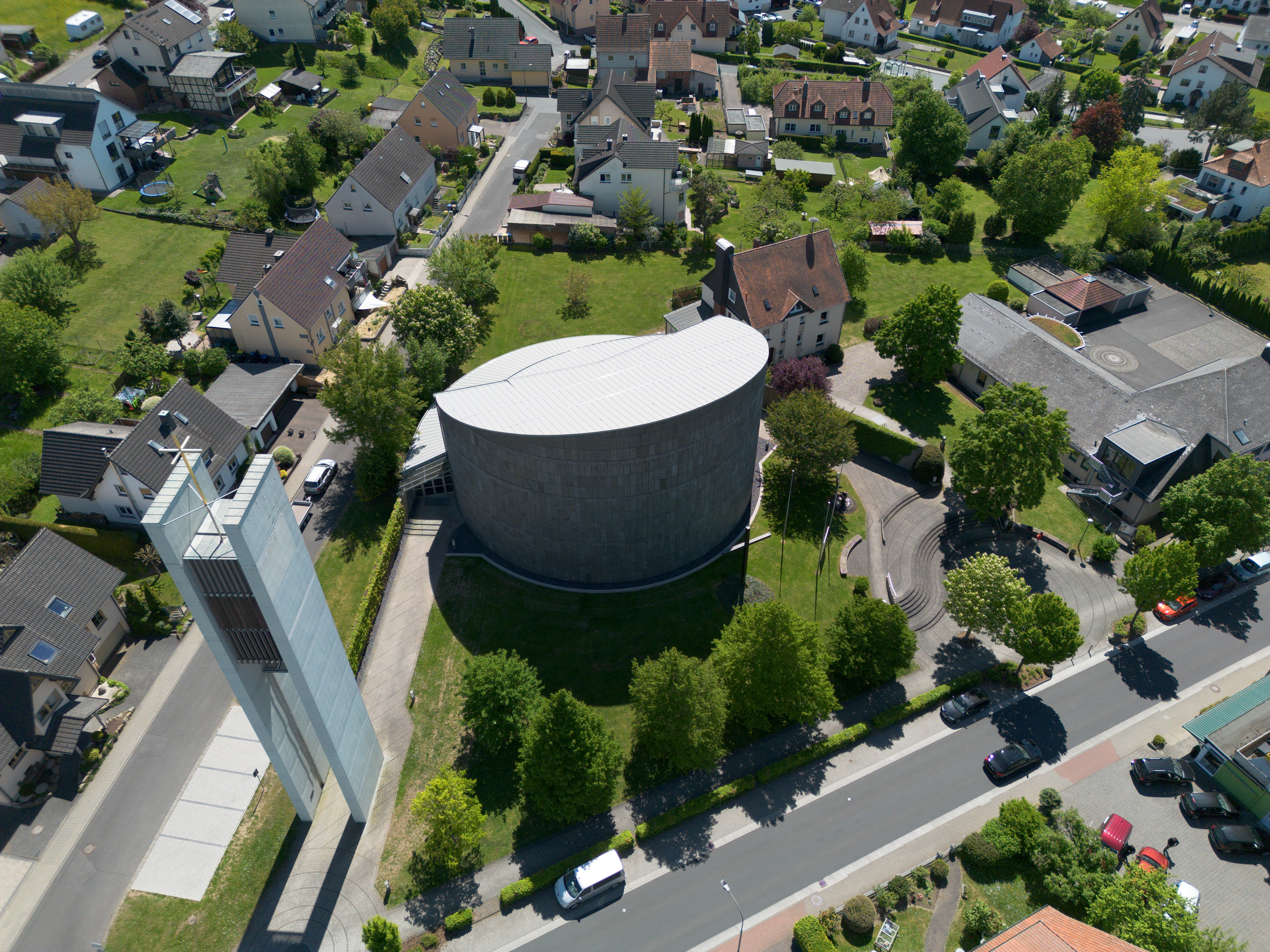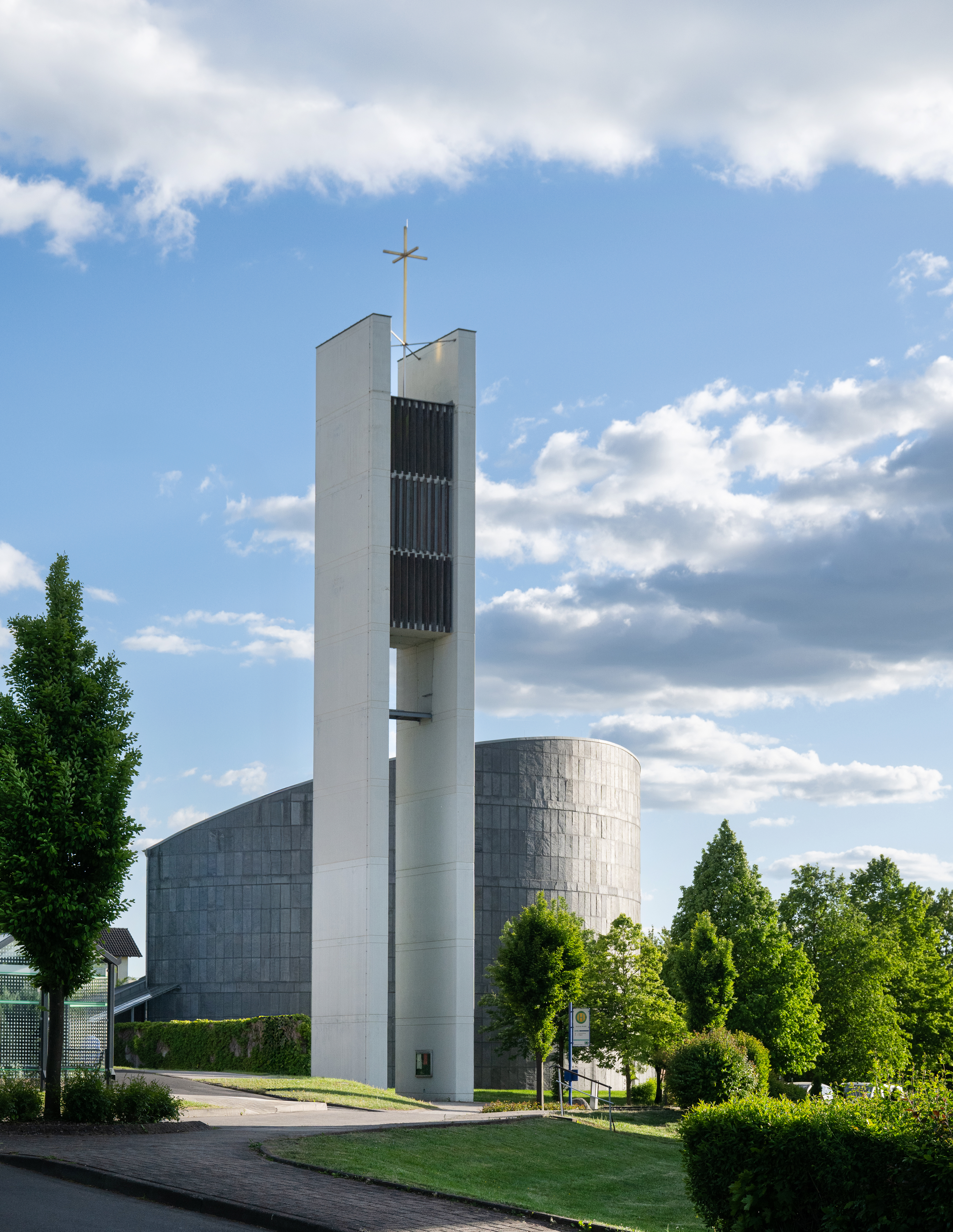 Es ist ein ‚stattlicher moderner Bau. … Der mit blaugrauen Granitplatten verkleidete Rundbau hat ein einmal abgesetztes Pultdach und ist von einer parabelförmigen Sichtbetonmauer eingerahmt, an deren einen Ende sich der freistehende Glockenturm erhebt. Er besteht aus zwei Sichtbetonwänden, in der der Glockenstuhl eingehängt ist.