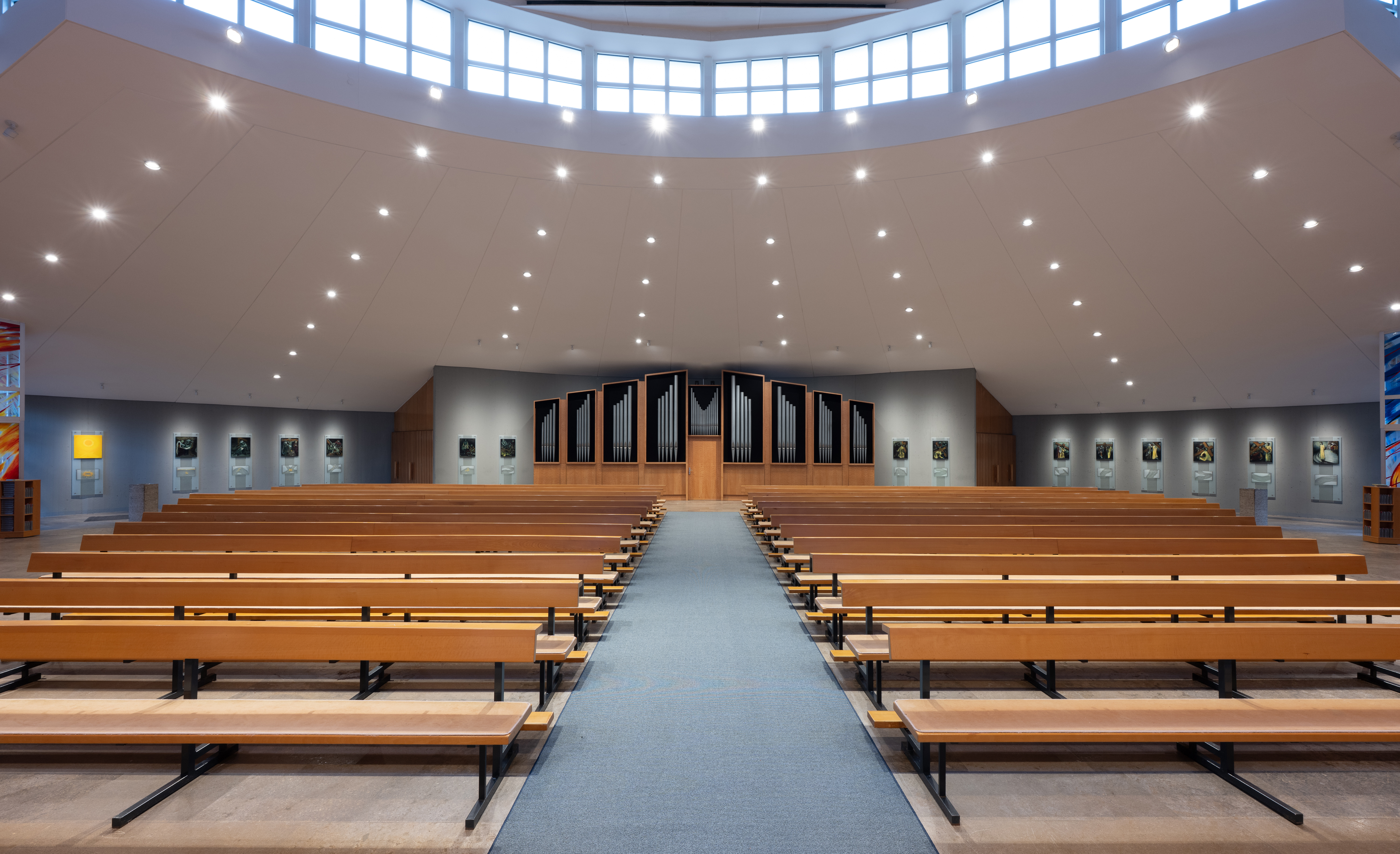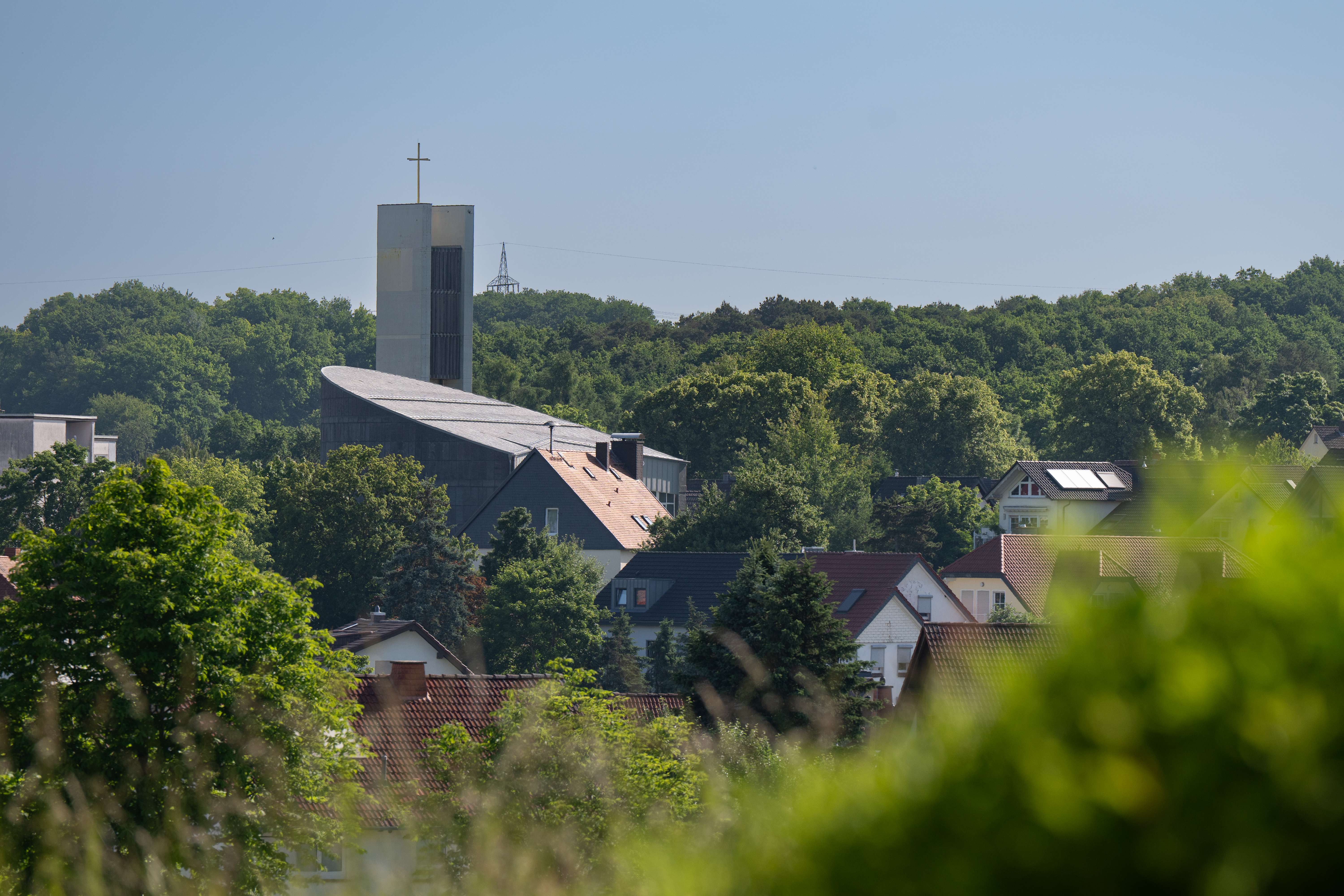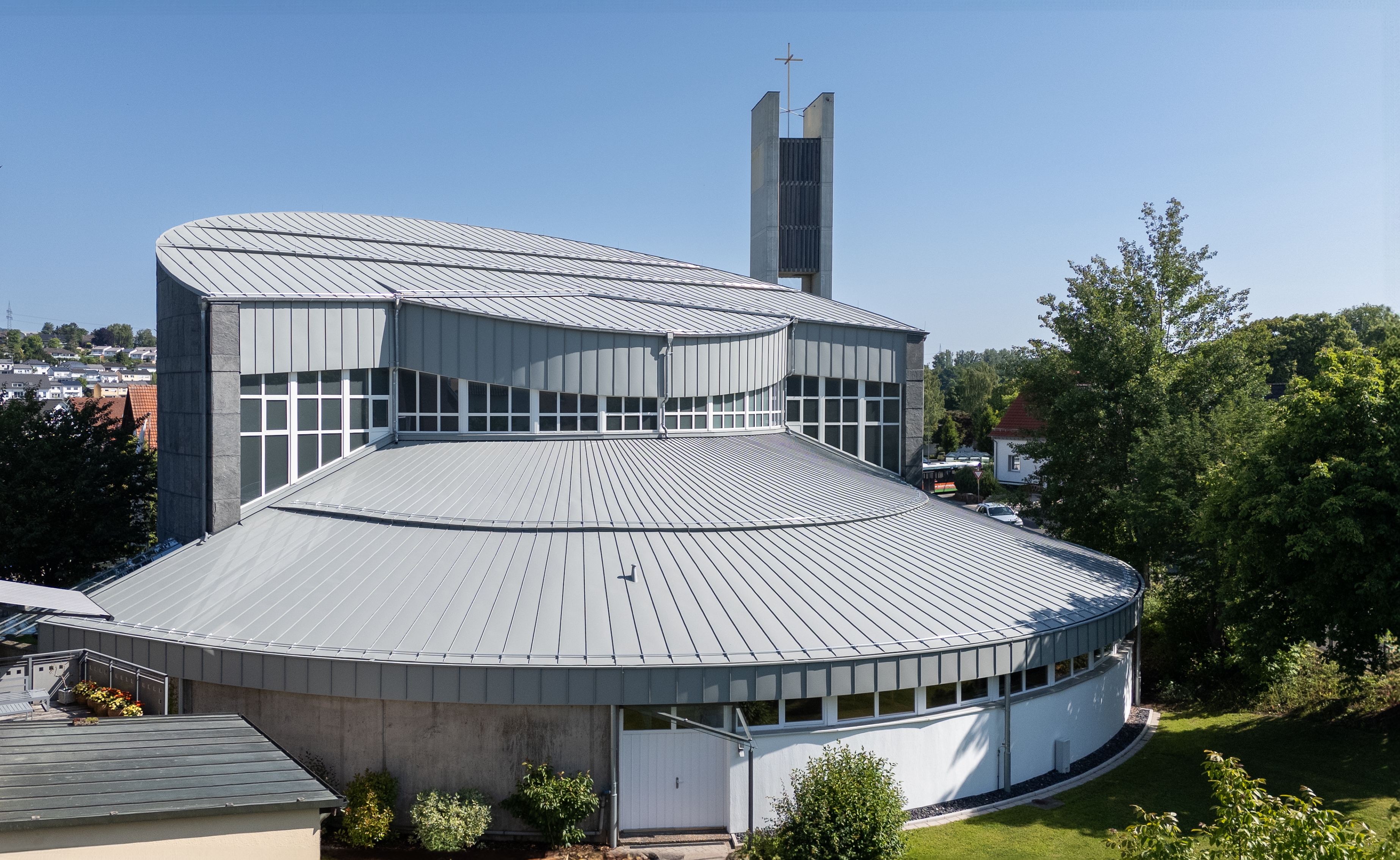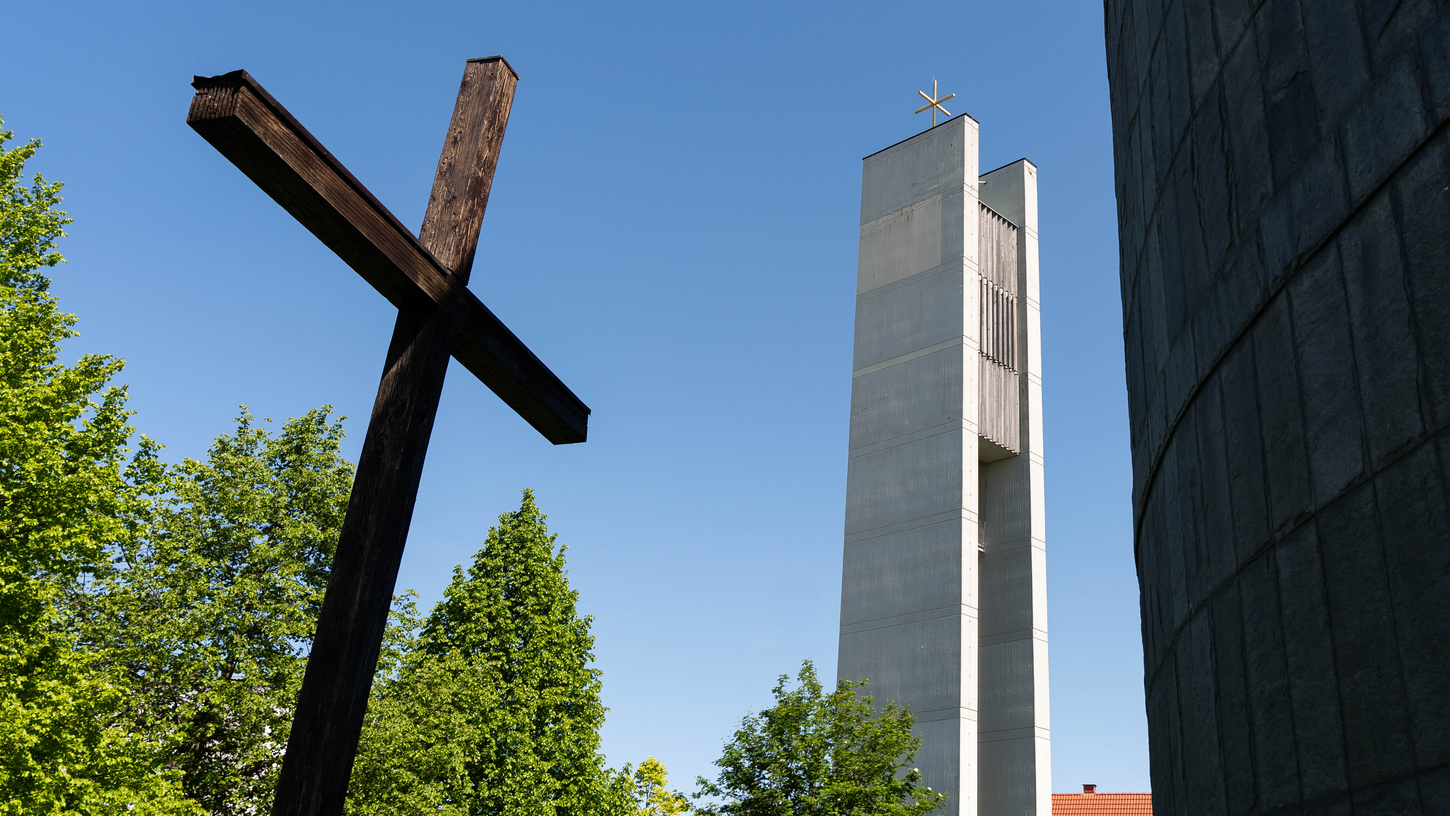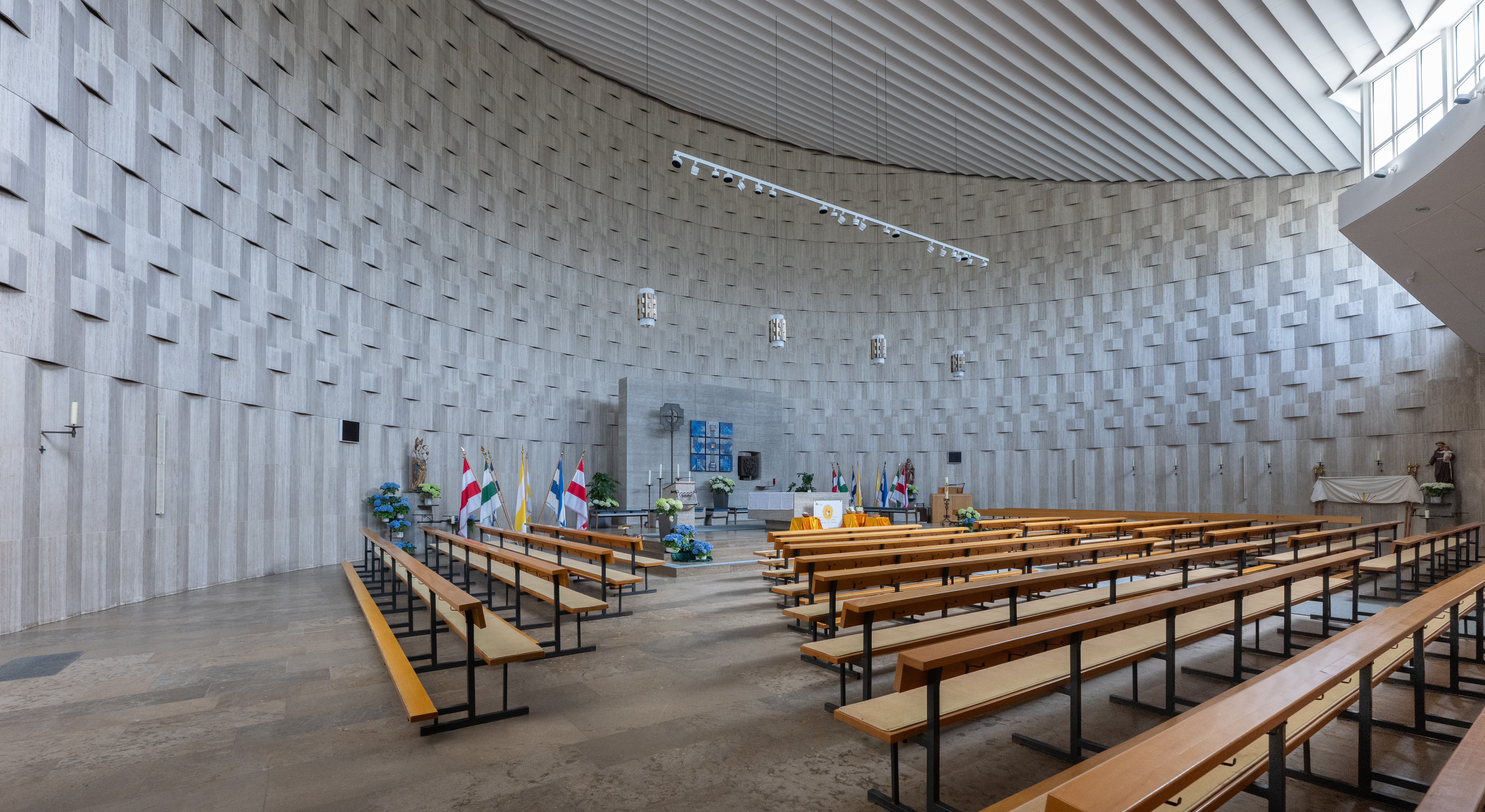 Es ist ein ‚stattlicher moderner Bau. … Der mit blaugrauen Granitplatten verkleidete Rundbau hat ein einmal abgesetztes Pultdach und ist von einer parabelförmigen Sichtbetonmauer eingerahmt, an deren einen Ende sich der freistehende Glockenturm erhebt. Er besteht aus zwei Sichtbetonwänden, in der der Glockenstuhl eingehängt ist.