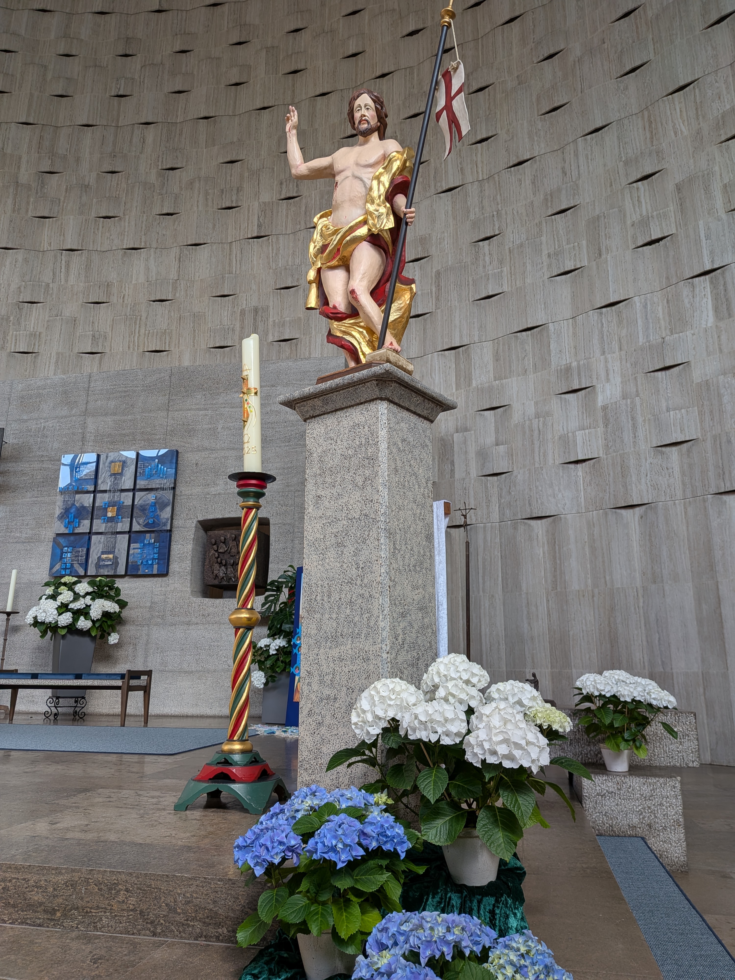 Betritt man nun den Altarraum, so erblickt man zentral das den Altarraum zierende Altarbildnis mit dem Titel ‚Gott hat alles nach Zeit und Maß gemacht’. Der Mensch, der von Gott geschaffen ist, ist nun von seinem Schöpfer in diese Zeit hineingestellt. Er kann in dieser Welt alles zählen und messen.