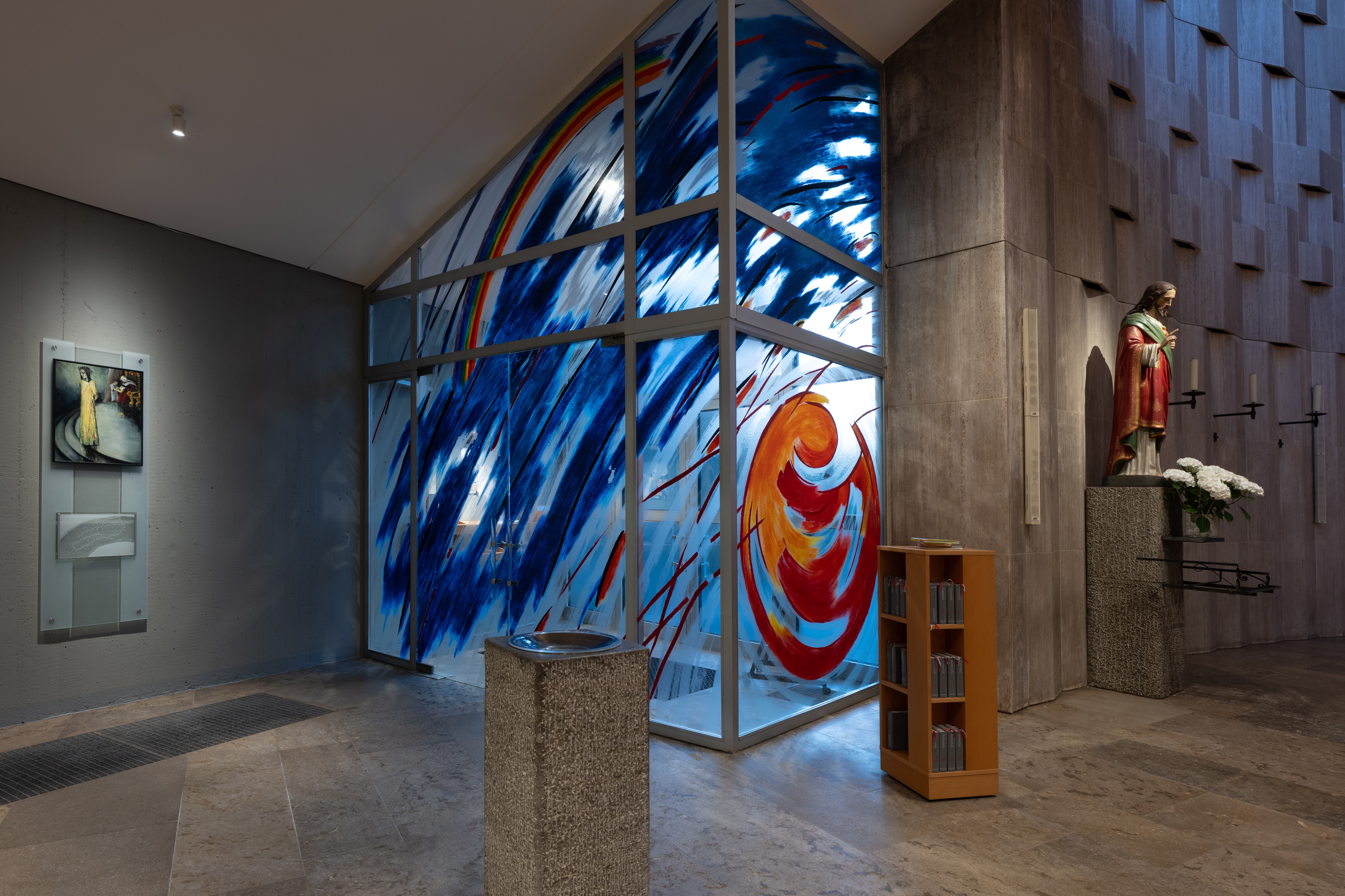 Hier empfängt uns in der rechten Windfanganlage des Eingangs der Gedanke, dass der Mensch von Gott dem Schöpfer in die Welt hinein geschaffen ist (vgl. Gen 1,27 ff.). Der Bund Noahs mit Gott (vgl. Gen. 9,13f.) und die Urströme des lebendigen Wassers in der Schöpfung kehren in den Blautönen und dem Regenbogen in der Gestaltung der Künstlerin Frau Ingrid Moll-Horstmann (Paderborn) wieder.