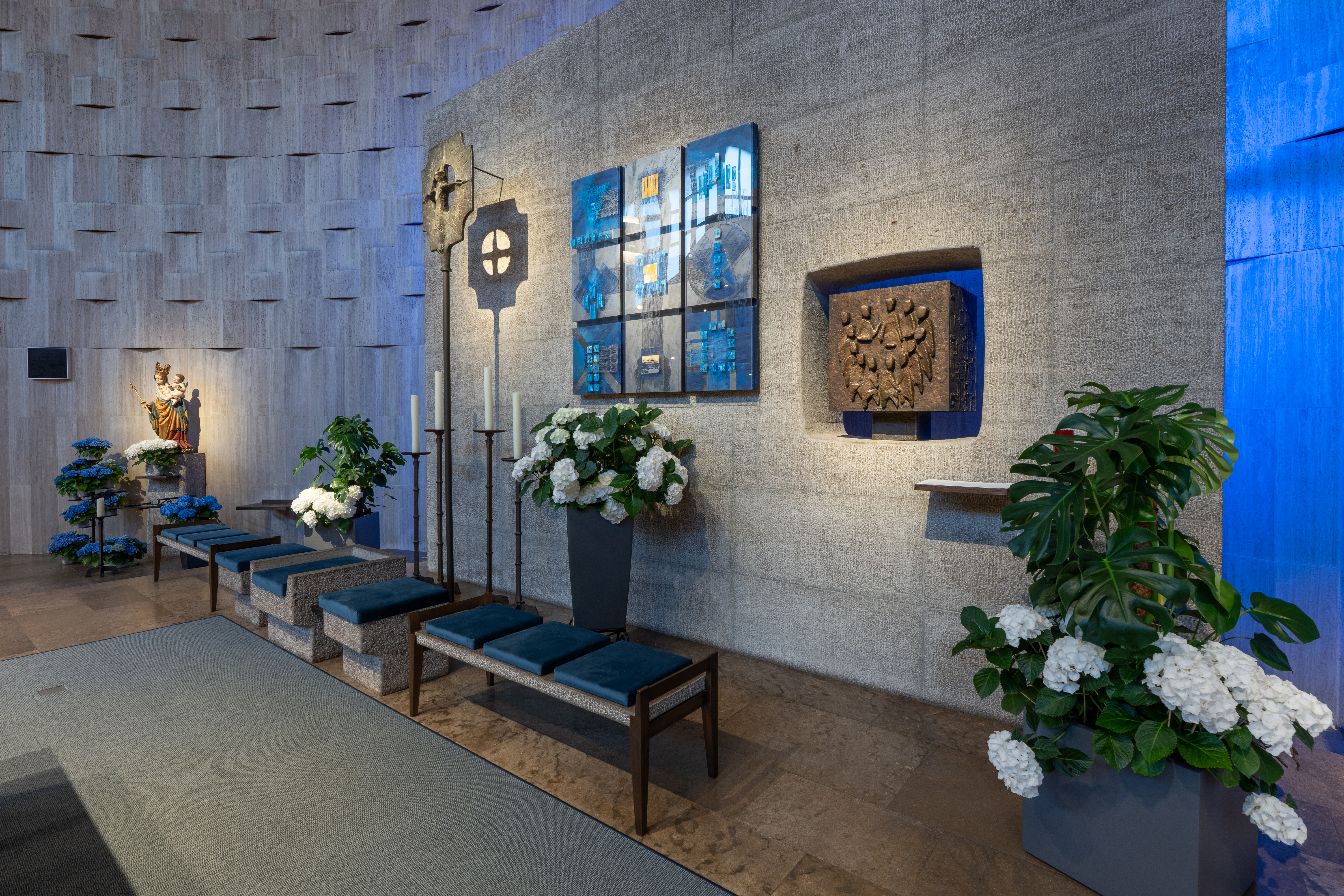 Die Mauern rechts und links, - so der Architekt unserer St. Antonius-Kirche Erich Weber - begleiten uns ‚Armen gleich’ in einen sakralen Raum.