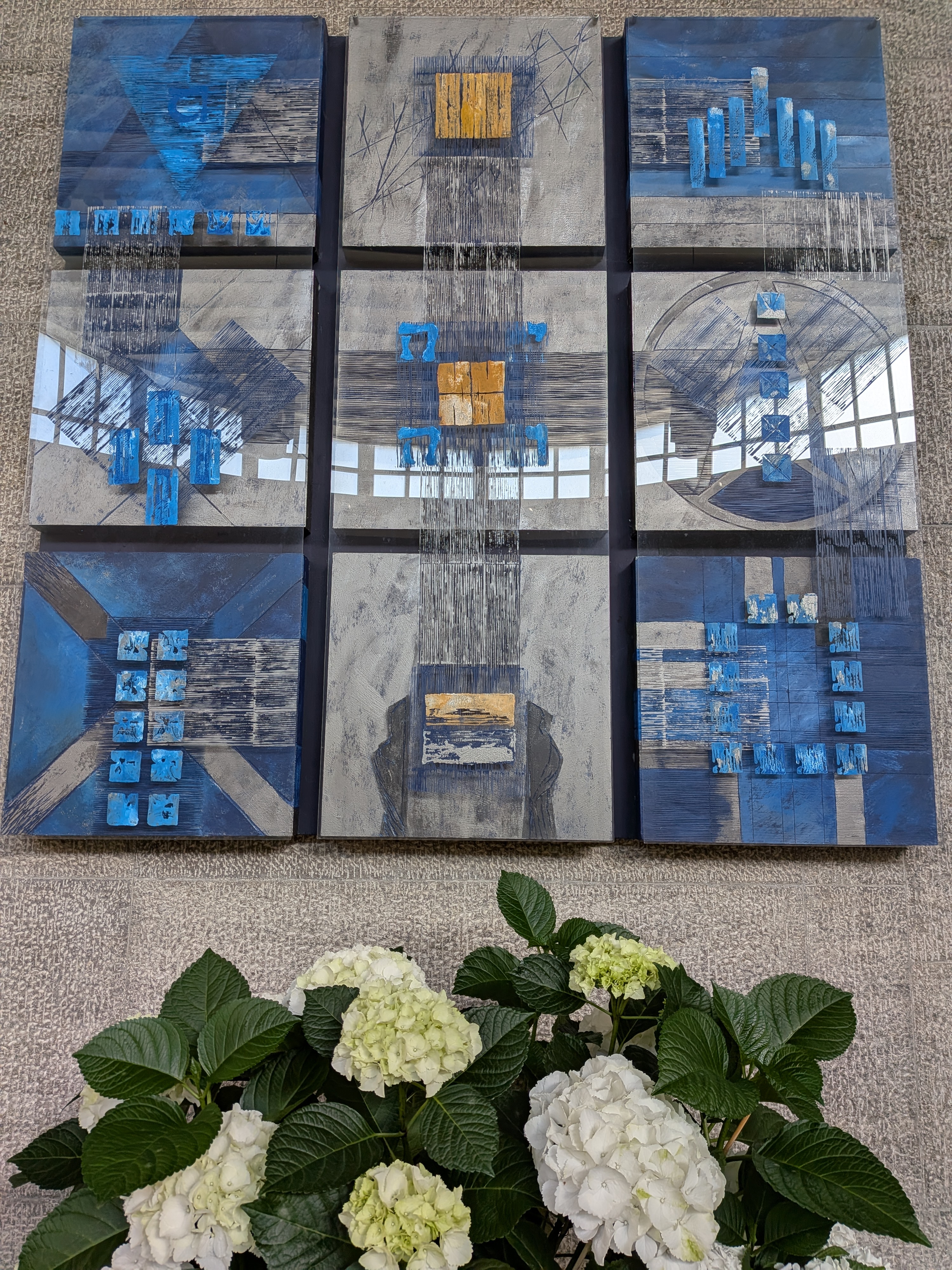 Neun Blöcke a 50x50x5 cm sind auf einer Holzplatte, darüber im Abstand von 2cm 3 Plexiglasscheiben montiert. Fünf silberne Blöcke ergeben ein gleichschenkeliges Kreuz; die Ecken füllen vier blaue Blöcke. Die Blöcke wurden zuerst mit einem Hohleisen bearbeitet, so dass schmale Bänder entstanden, die auch ein Kreuz ergeben, aber auch die Verbindung der Blöcke herstellten. Die Blöcke sind mit Acrylfarben bemalt, das Kreuz mit Metallic-Farben. Die Plexiglasscheiben wurden mit Acrylfarben bedruckt.